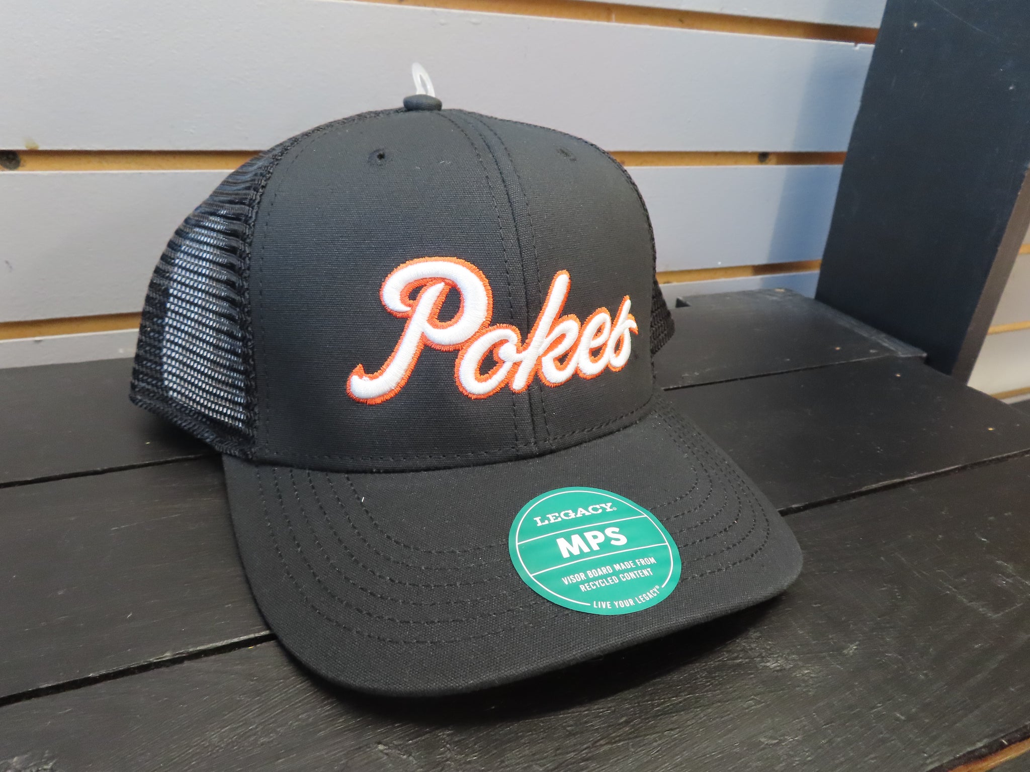 Script Pokes Embroidered on wither white or black trucker hat.